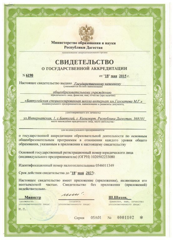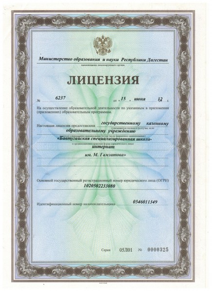 | Полное наименование образовательной организации* | Государственное казенное общеобразовательное учреждение Республики Дагестан "Бавтугайскаяспециализированная школа-интернат им.М.Г.Гамзатова" |